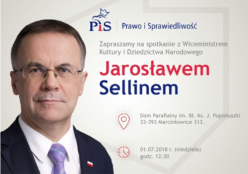 W ramach otwartych spotkań organizowanych przez Prawo i Sprawiedliwość pod nazwą „Polska jest jedna” odbędzie się spotkanie: z Panem Jarosławem Sellinem Wiceministrem Kultury i Dziedzictwa Narodowego: w dniu 1 lipca 2018r. (niedziela), o godz. 12.30, w Domu Parafialnym im. Bł. Ks. J. Popiełuszki, 33-393 Marcinkowice 313.