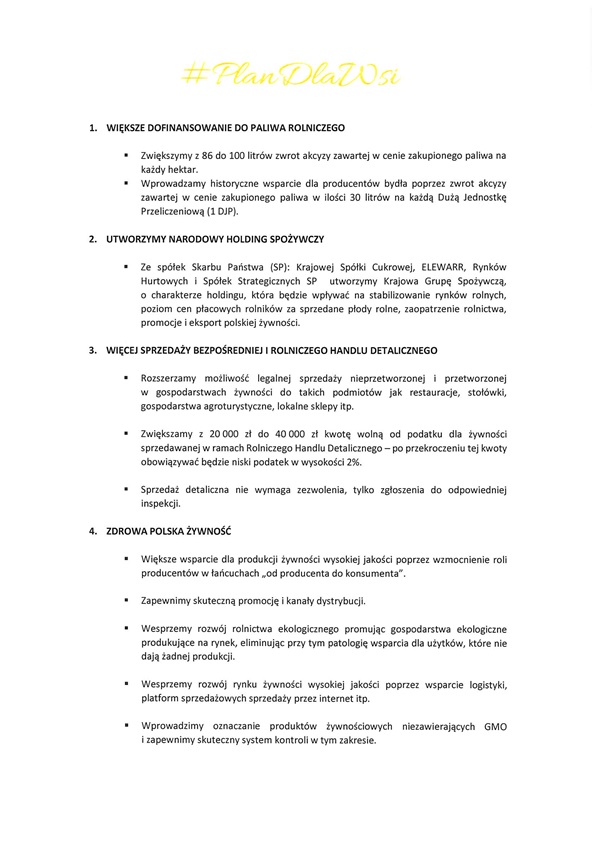 Drugim tematem który omówił Pełnomocnik to inicjatywa Rządu, która jest podejmowana w kierunku branży Rolnictwa. Przedstawił i opisał # Plan Dla Wsi. Mianowicie zostanie zwiększone dofinasowanie do paliwa rolniczego z 86 do 100 litrów w postaci zwrotu akcyzy zawartej w cenie zakupionego paliwa na każdy hektar. Ponadto zostanie wprowadzone historyczne wsparcie dla producentów bydła poprzez zwrot akcyzy zawartej w cenie zakupionego paliwa w ilości 30 litrów na każdą Dużą Jednostkę Przeliczeniową (1DJP). Zostanie Utworzony Narodowy Holding Spożywczy oraz zostanie zwiększona sprzedaż bezpośrednia i sprzedaż rolniczego handlu detalicznego. Rząd zwiększy wsparcie dla produkcji Polskiej żywności wysokiej jakości, będzie wspierał rozwój rolnictwa ekologicznego oraz wprowadzi oznaczania produktów żywności niezawierających GMO i zapewni skuteczny system kontroli w tym zakresie. Wspomniał również o wsparciu rolnictwa na terenach górskich, wdrożeniu systemu poprawy żyzności gleb oraz o nowych zasadach produkcji Polskich Pasz. Zaznaczył ważność sprawy i wykorzystanie rolnictwa dla przemysłu.