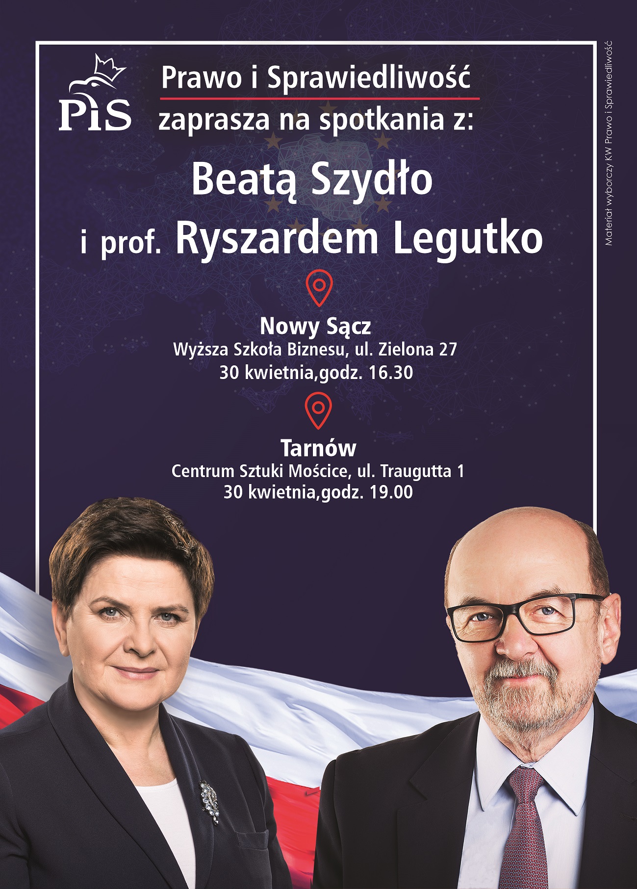 Serdecznie zapraszamy Członków i Sympatyków PiS oraz wszystkich zainteresowanych Mieszkańców na spotkanie otwarte z Panią Premier Beata Szydło i Panem Prof. Ryszard Legutko i Prezesem PiS Jarosławem Kaczyńskim w dniu 30 kwietnia 2019r. (wtorek) o godz. 16.30.