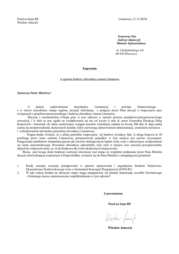 z zapytaniem poselskim do Ministra Infrastruktury Andrzeja Adamczyka.