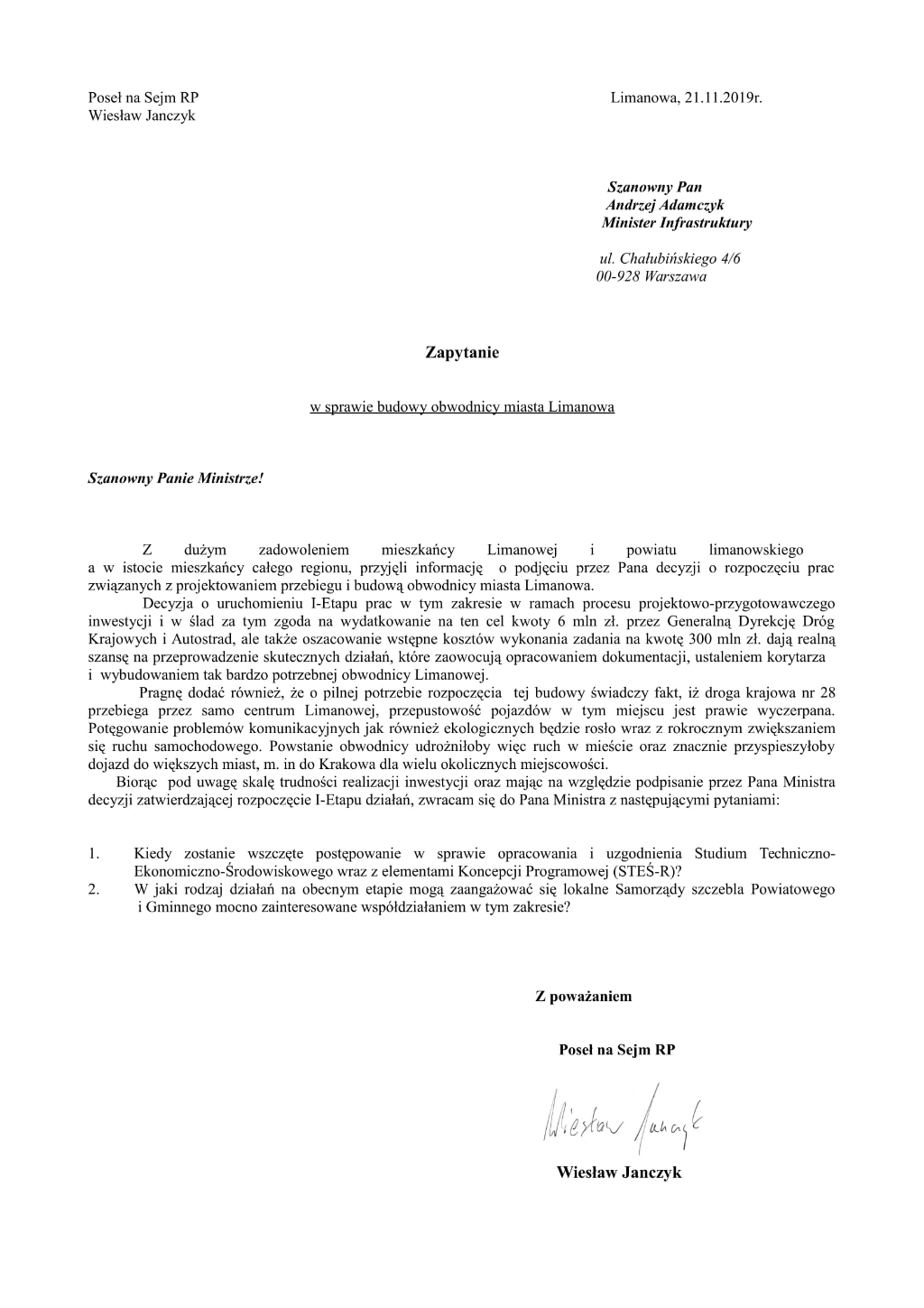 Zapytanie w sprawie budowy obwodnicy w Limanowej